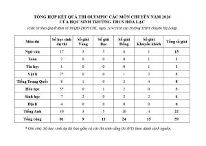 Một cuộc thi nữa lại ghi nhận những bước tiến vững chắc của thầy và trò Trường THCS Hòa Lạc khi tham gia Cuộc thi Olympic các môn chuyên dành cho học sinh THCS lần thứ 3, năm học 2025 – 2026 do Trường THPT Chuyên Hạ Long tổ chức. Không chỉ là sân chơi trí tuệ, cuộc thi còn là nơi khẳng định bản lĩnh và chất lượng giáo dục của nhà trường.